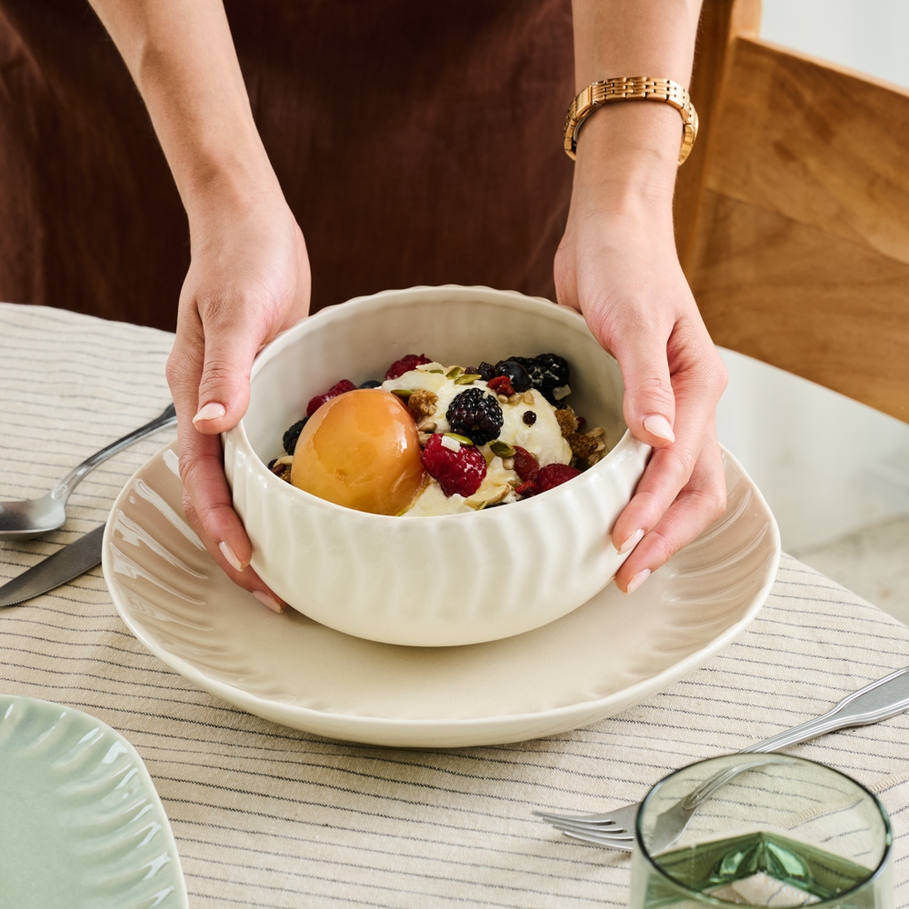 A rippled, debossed pattern traces the outer edges of the Ritual collection adding a sense of gentle movement and refined tactility. The porcelain Hug Bowl is designed by Sarah Strickland and features a dappled, reactive, gloss glaze in a creamy Frost. It's perfectly balanced, rounded form nestles naturally in your palms, a comforting size made for holding close as you savour your favourite meal.