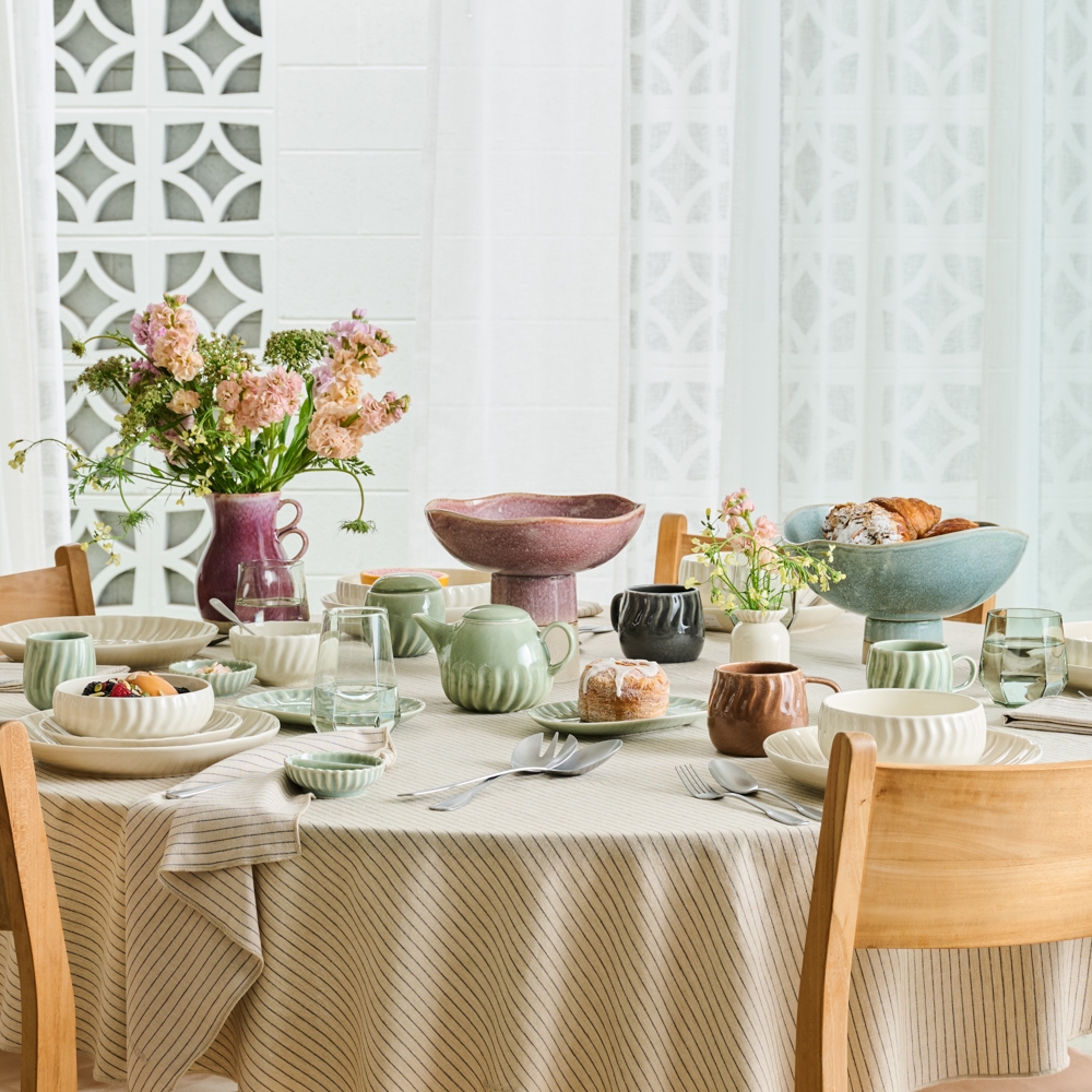 A rippled, debossed pattern traces the outer edges of the Ritual collection adding a sense of gentle movement and refined tactility. These porcelain dining and serving pieces feature a dappled reactive, gloss glaze in a calming Willow green, creamy Frost, Sienna brown and Midnight charcoal. Designed by Sarah Strickland, the varied pieces have been thoughtfully crafted to mix and match with ease.