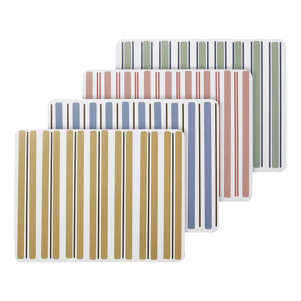 Classic stripes in contrasting widths define Ecology's Harbour collection. Offering traditional square coasters and rectangle placemats, these pieces feature hard tops and cork-backed bases. Available in sets of four assorted beachy-hues, these pieces bring the seaside to the table.