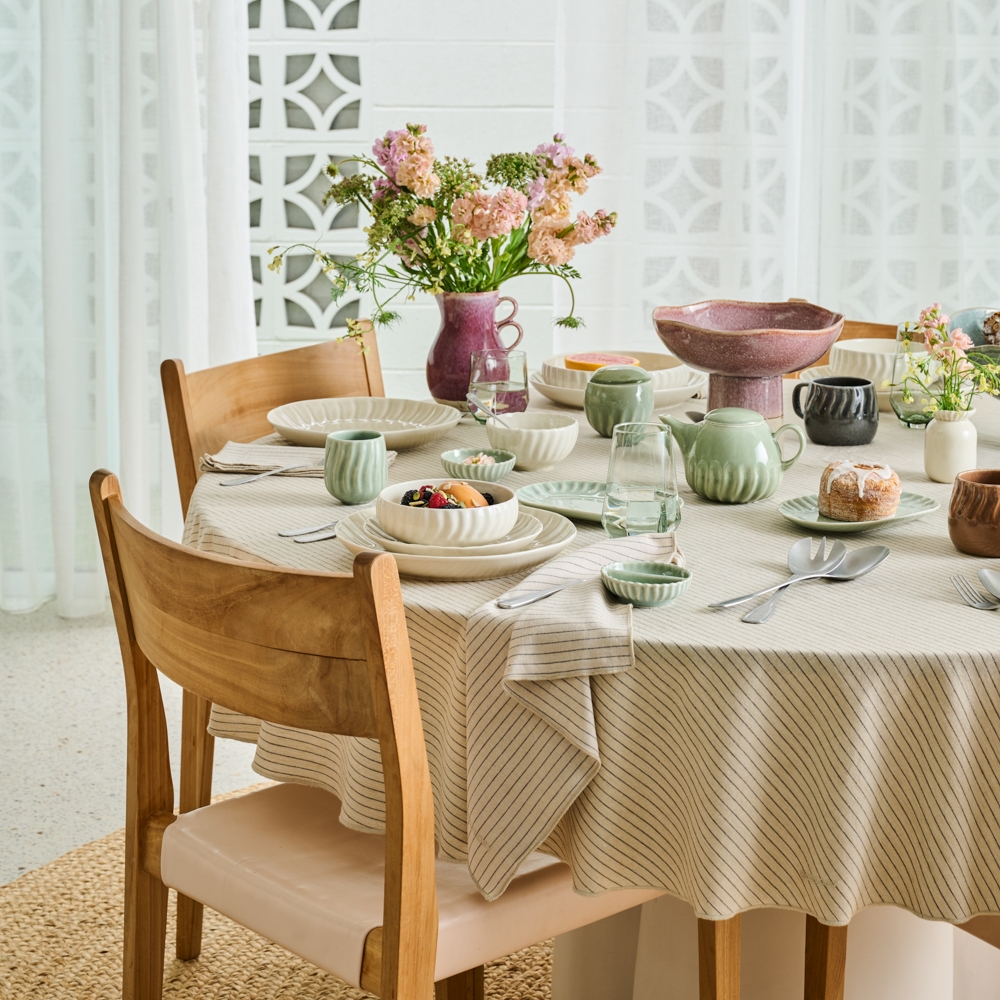 A rippled, debossed pattern traces the outer edges of the Ritual collection adding a sense of gentle movement and refined tactility. These porcelain dining and serving pieces feature a dappled reactive, gloss glaze in a calming Willow green, and a creamy Frost. Designed by Sarah Strickland, the varied pieces have been thoughtfully crafted to mix and match with ease.